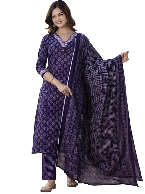 Women’s Pure Cotton Printed With Handwork Kurta with Pants and Dupatta Set
